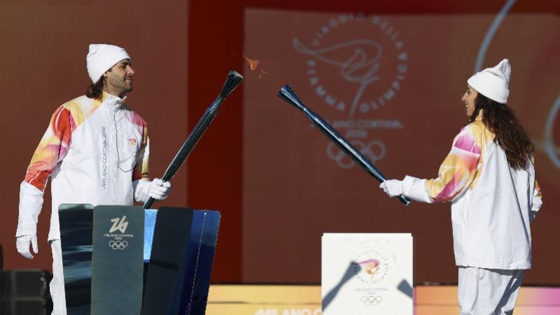 12月6日,火炬手、意大利前击剑运动员迪弗朗西斯卡(右)与田径运动员坦贝里交接。当日,2026年米兰-科尔蒂纳冬奥会火炬本土传递在意大利罗马正式启动。 新华社发