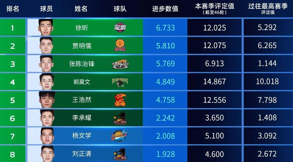 徐昕本赛季的进步有目共睹,数据更不会说谎,除了场均封盖是联盟第一外,徐昕的真实命中率达到了76.5%,也是联盟第一;有效命中率75.8%,位居联盟第二。另外在攻防效率上,徐昕的进攻效率排名全联盟第18位,防守效率排名全联盟第21,获胜贡献值排名联盟第13,这些数据无不彰显了徐昕的进步。如果继续这么打下去的话,徐昕很可能会获得本赛季的最佳进步球员奖项。排在徐昕后面的,是山西男篮的贾明儒和辽宁男篮的张陈治锋,这两人在本赛季的进步也非常明显。