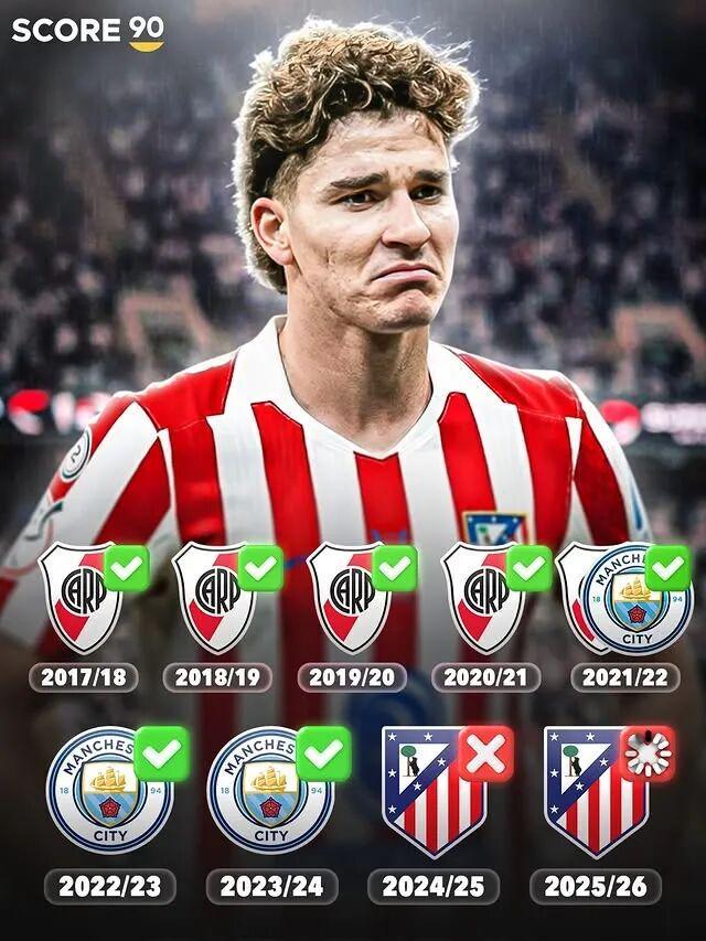 现年26岁的阿尔瓦雷斯,曾是足坛公认的“冠军体质”球员,职业生涯起步便顺风顺水,出道前7年狂揽17座冠军奖杯,2018年至2024年间更是年年捧杯,从未经历过无冠赛季。世界杯冠军、欧冠冠军、英超冠军、美洲杯冠军、南美解放者杯冠军等重量级锦标悉数收入麾下,年纪轻轻便实现了俱乐部与国家队层面的荣誉大满贯,这份夺冠履历在同龄球员中堪称独一档。
