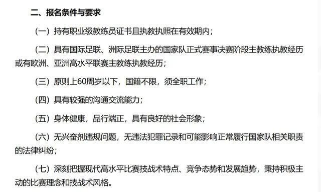 应聘者首先需要持有职业级教练员证书且执教执照在有效期内;其次具有国际足联、洲际足联主办的国家队正式比赛决赛阶段主教练执教经历或欧洲、亚洲高水平联赛主教练执教经历。
